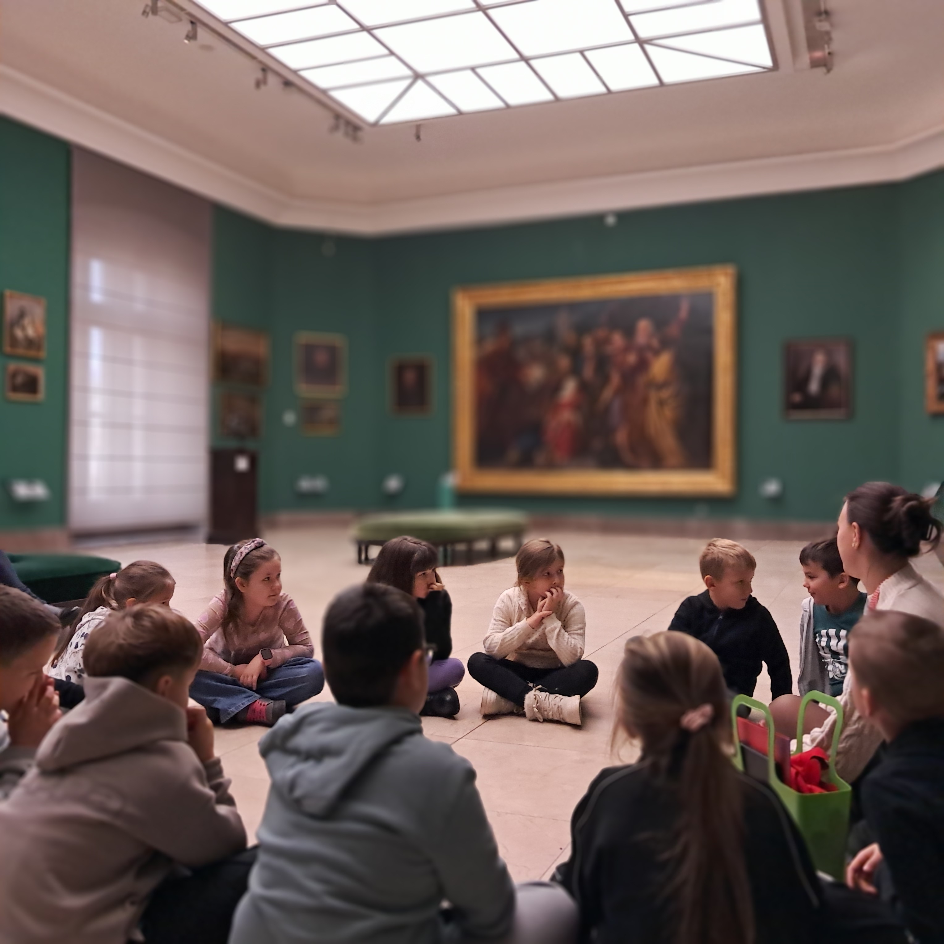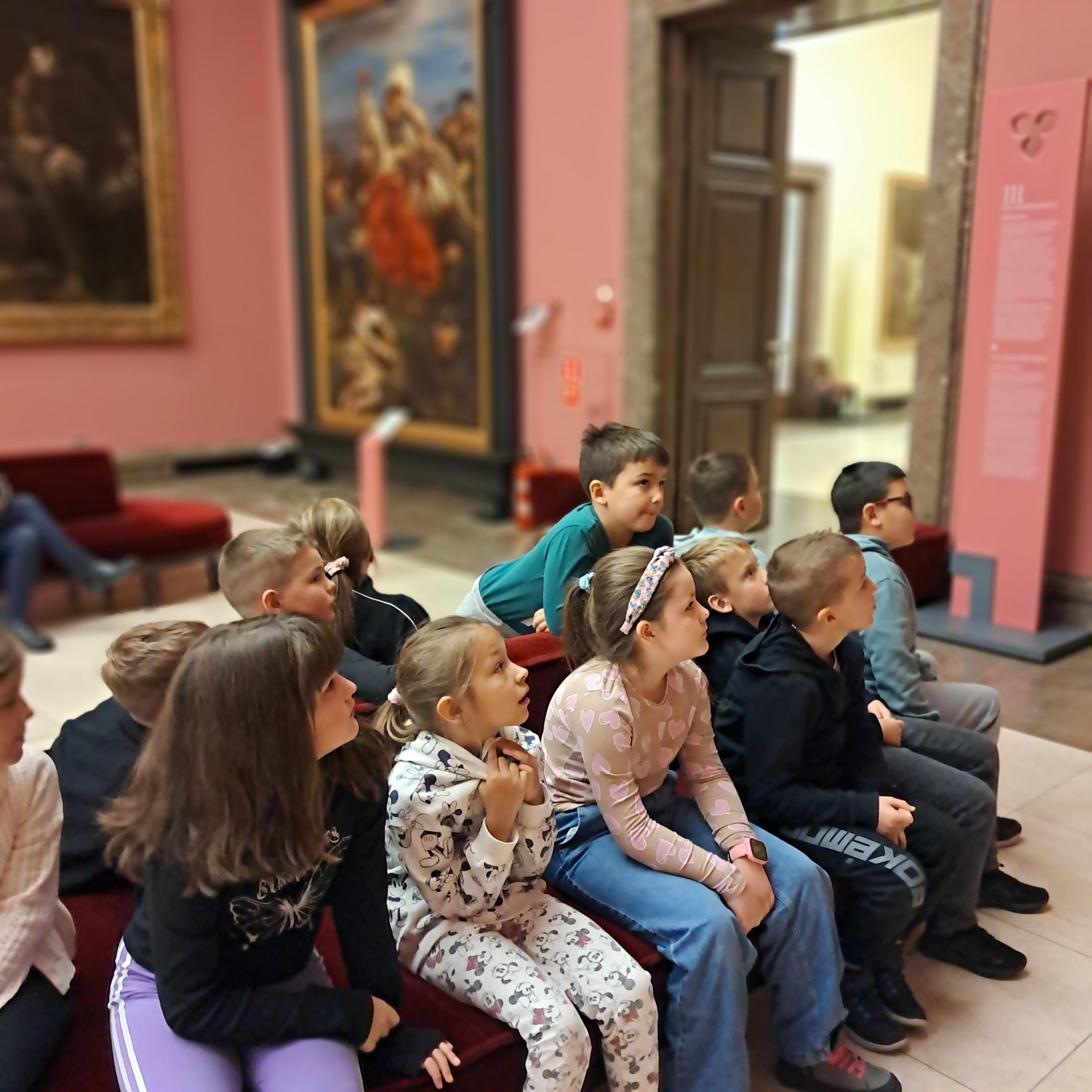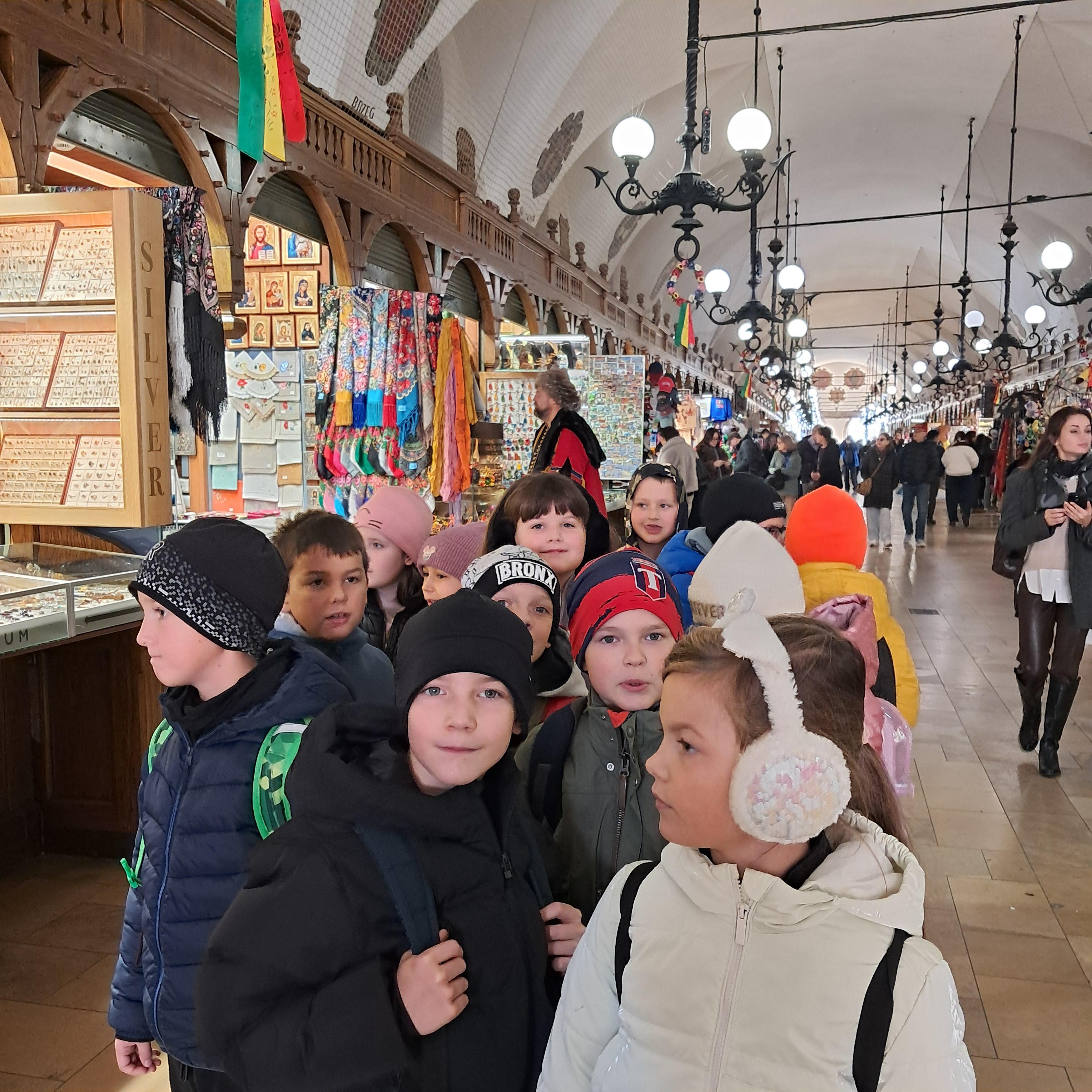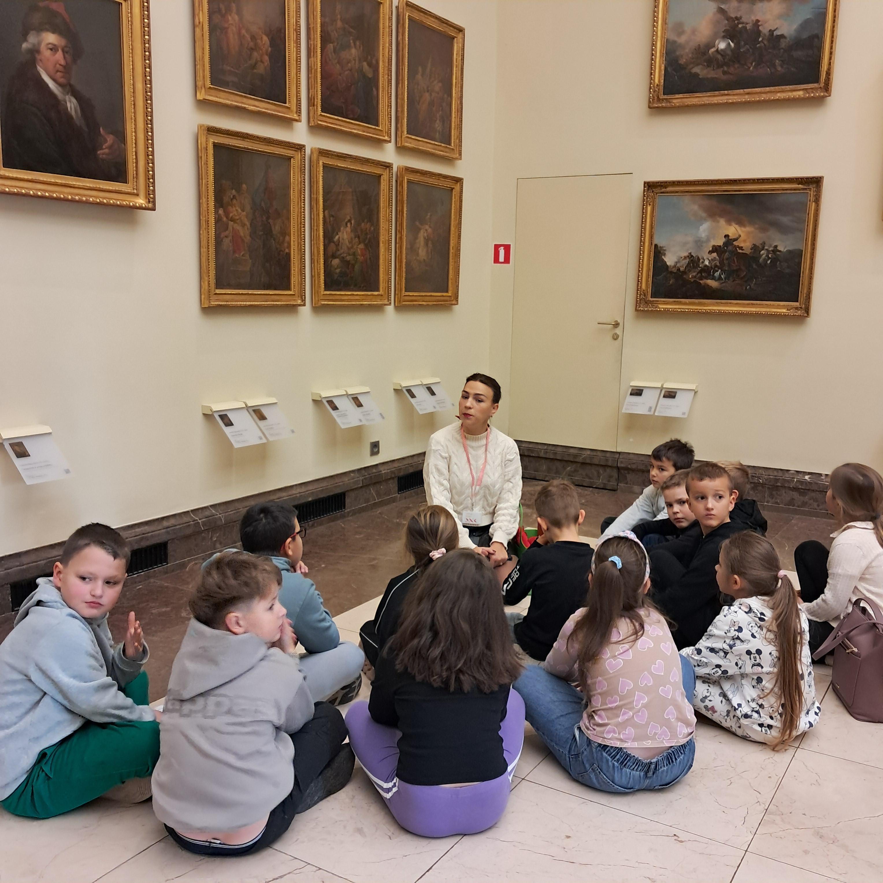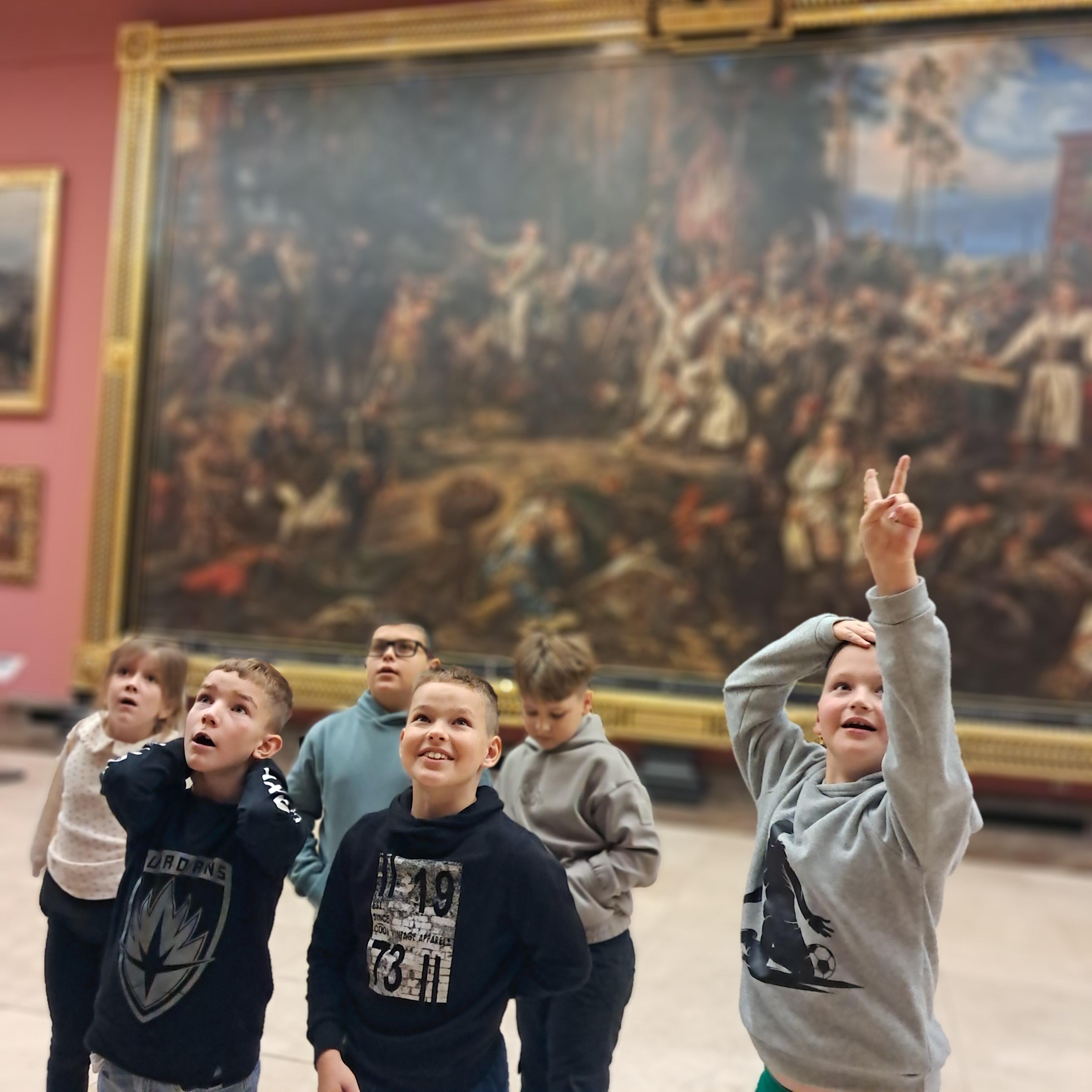 16 października 2025 r. klasa 2 wybrała się na wycieczkę do Muzeum w Sukiennicach. Uczniowie z zaciekawieniem podziwiali słynne obrazy polskich malarzy, między innymi Jana Matejki i Józefa Chełmońskiego. Przewodnik ciekawie opowiadał o historii obrazów, życiu artystów oraz legendach krakowskich przedstawionych na obrazach. Dzieci z zaciekawieniem rozpoznawały postacie z opowieści i uczyły się, jak sztuka pomaga utrwalać legendy. Wycieczka była ciekawą lekcją historii i sztuki.